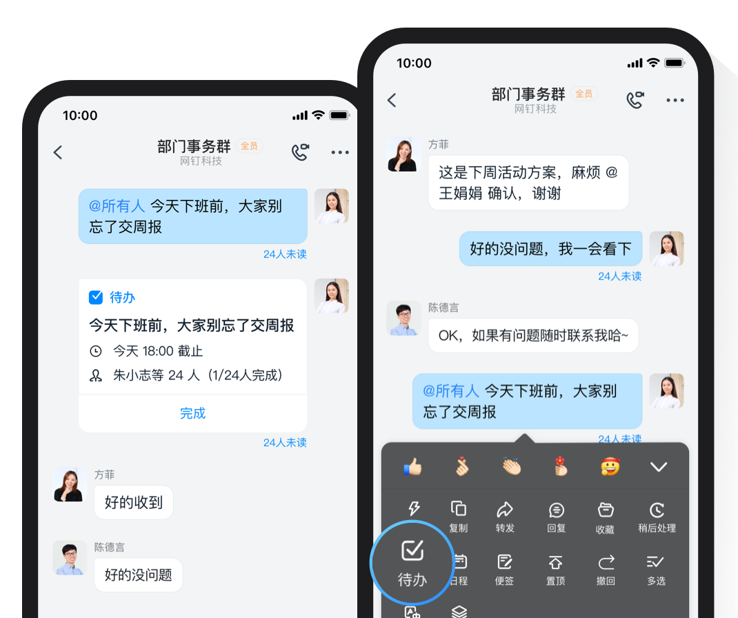 釘釘群直接創建待辦,指派到人,還可添加協作同事,一鍵催辦,確保事情件件落實。